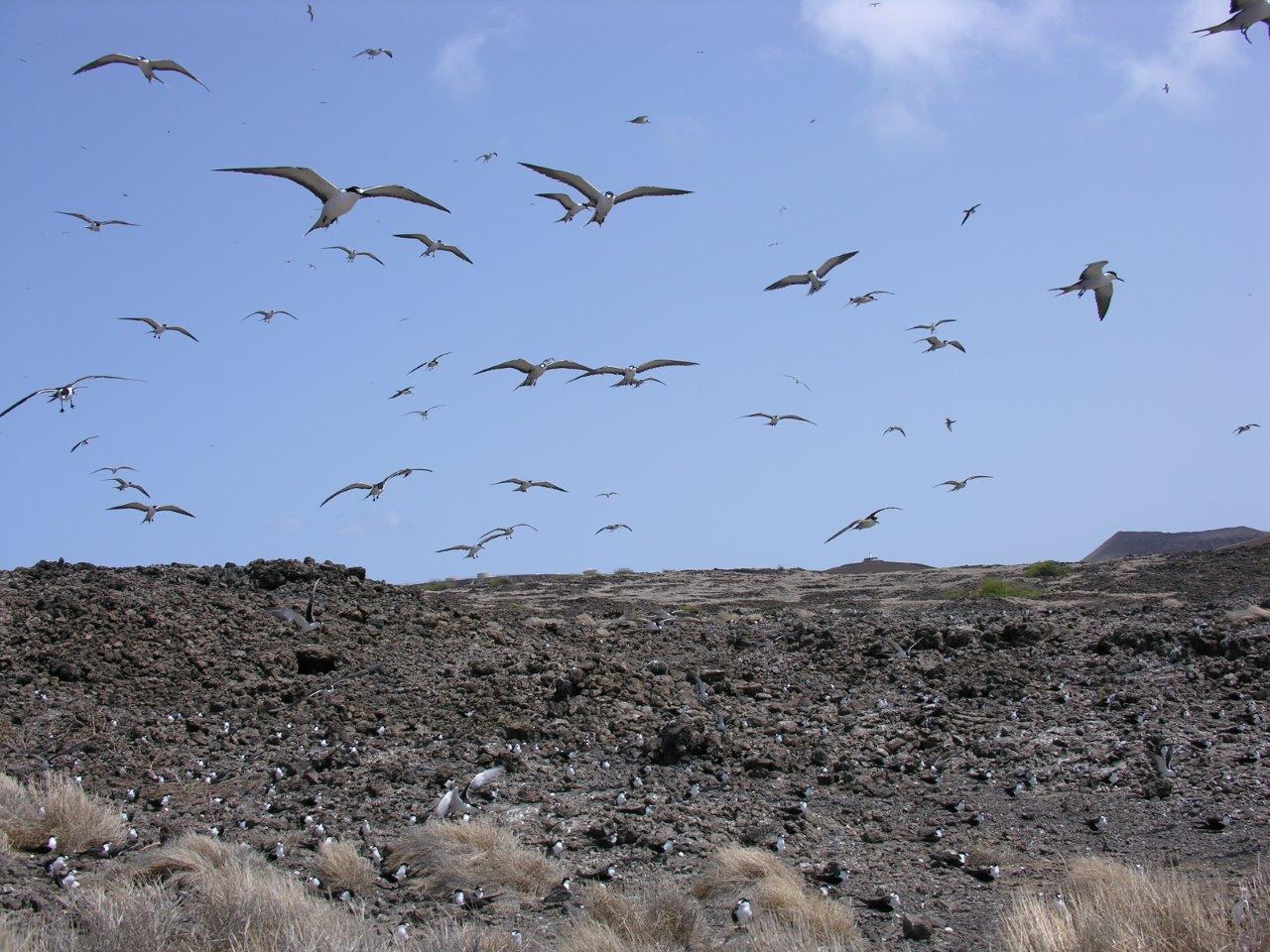 Until very recently, most seabirds, including the world population of the critically endangered Ascension frigate-bird Fregata aquila, bred only on the outer rocky stack, Boatswainbird Island. Before humans introduced invasive species, Ascension itself had been a hugely important colony providing the only nesting location for seabirds over large tracts of the Atlantic Ocean. Following the successful efforts of conservationists to remove feral cats from the island, in 2014, the first frigatebird chick hatched on the mainland in over a century. Other seabird species also are re-colonising the main island.