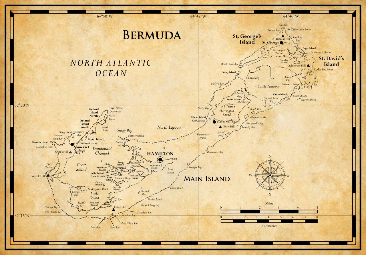 Bermuda, the oldest of the UK’s remaining Overseas Territories, is located in the western North Atlantic, 965 km east of Cape Hatteras, USA. With a total land area of just 55 km², it comprises over 150 limestone islands that sit on the largest of three volcanic seamounts formed about 110 million years ago. Influenced by the warm waters of the Gulf Stream, Bermuda’s shallow-water platform covers an area of about 1000 km², and supports the northernmost coral-reef system in the world. Bermuda’s low-rolling hills are largely suburban in character, supporting a resident population of over 60,000 concentrated on the 7 largest islands.